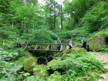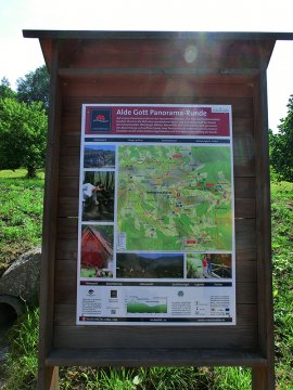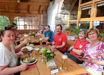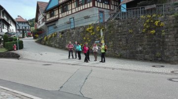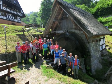 Danach ging es über die Weinberge, immer wieder mit Blick auf den inzwischen wolkenverhangenen Gipfel der Hornisgrinde Richtung Gaishölle. Diesem recht steil abfallenden kleinen Wasserlauf folgten wir in in mehreren steilen Treppenpassagen aufwärts bis zu unserem Endziel dem Spinnerhof. Dor angekommen belohnten wir uns mit den guten angebotenen Essenspezialitäten und dem ein oder anderen Getränk. Leider war die eigentliche Attraktivität des Hauses die überdimensionale "Schwarzwälder Kirschtorte" an diesem Tag komplett ausverkauft. Für uns ein sicherer Grund, hier irgendwann mal wieder einzukehren. Die Wanderzeit betrug 5 Stunden. Obwohl es immer wieder nach gemächlichen Parts auch bergauf ging waren die ca. 13 Kilometer für jeden der Wanderinnen und Wanderer gut machbar.