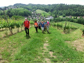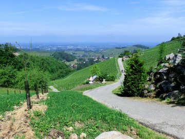 Die erste größere Pause zur Mittagszeit hatten wir uns bei Sonnenschein an einem schönen Aussichtspunkt inmitten der ersten Teiletappe redlich verdient. Gut gestärkt ging es dann weiter - zunächst talabwärts. Bevor wir dann den nächsten größeren Anstieg über die Weinberge angingen, führte uns der Weg am Weingut Schelzberg vorbei. Ein dort aufgestelltes Eingangsschild weckte unsere soziale Ader und wir ließen uns spontan zu einer kleinen, aber auch notwendigen Trinkpause inspirieren.